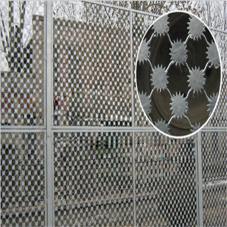 3、梅花网 主要采用钢板冲压或者激光切割成的刺片,用氩弧焊将刺片焊接在美格网的节点上,形成了刺形保护有效的防止了手握脚攀。材质一般为不锈钢材质也有采用热镀锌或者厚热镀锌或者浸塑防腐处理。