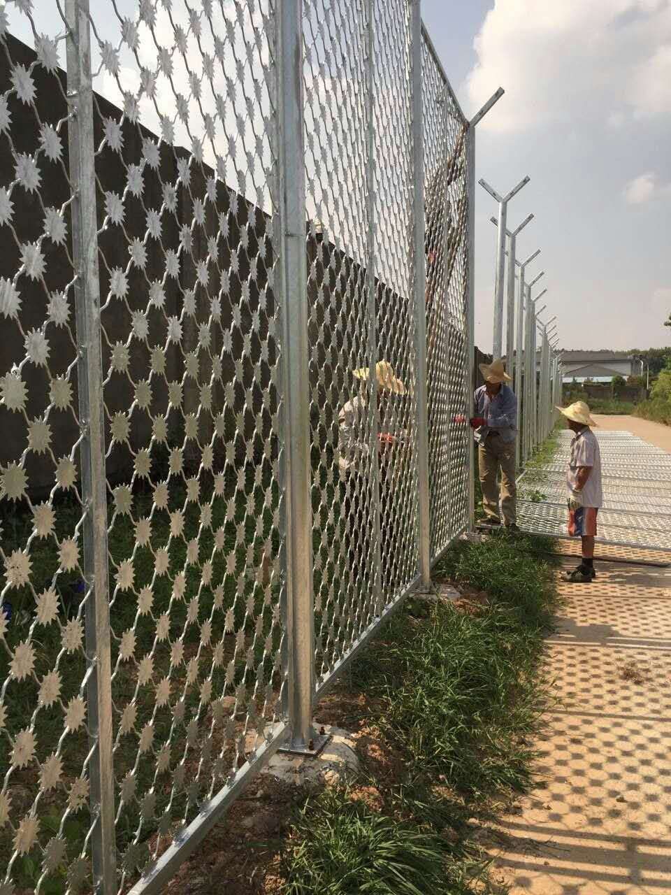 1、梅花刺片:梅花刺片直径不小于7.5cm(直径6cm、7cm、8cm),刺片由14个梅花刺组成,厚1.5mm,采用Q235低碳钢板冲压成型。梅花刺片用氩弧焊将梅花形刺片焊接在美格网的节点上,形成刺形保护,有效的防止了手握脚攀。